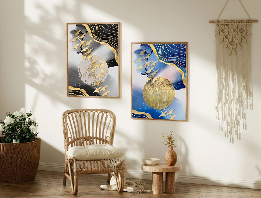 “Golden Flight” is a striking abstract wall art set that captures motion, freedom, and balance through flowing forms and metallic accents. Featuring graceful birds in flight against layered textures and a radiant circular focal element, this artwork brings a sense of elegance and calm energy to your space.