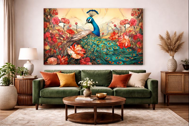 It’s a breathtaking unframed canvas painting that captures the timeless majesty of a peacock in full, glorious display.